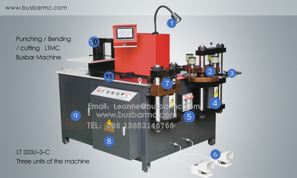 Esta serie de máquinas procesadoras de barras colectoras tiene tres unidades de procesamiento: punzonado, cizallado/corte y doblado. Las tres unidades se pueden utilizar simultánea o secuencialmente, la carrera de trabajo de cada unidad de procesamiento se puede ajustar fácilmente, lo que acorta el tiempo de procesamiento y mejora la eficiencia de producción. La función principal es el procesamiento de barras colectoras de cobre y aluminio.